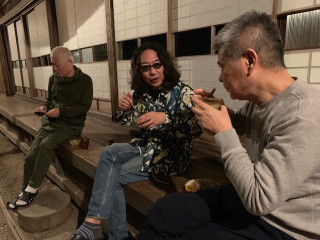 宿泊組の3人、縁側で、おそばを食べています。