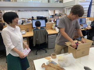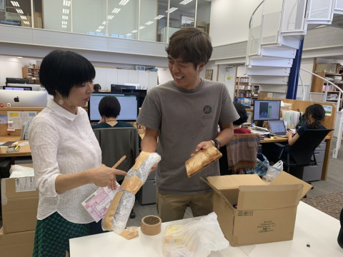 いろいろなこと。 印刷所から、ゲラがとどきました。 このゲラをカッターでシャーシャーと切り、さまざまな人々に確認に出さねばなりません。 作業台をみると、 本を作っているそうです。 奇遇ですな。 そうして、作業台を半分つかわせてもらっていたら、小脇で騒ぎが発生。 なにやら、取材先で使うものを現地に宅急便すべく、 「だって、こんな瓶とかが、紙袋にはいってるんですよ。」 紙袋は、ばすっと床に置かれていました。 その紙袋は、ゲラをいれるのに良さそうです。 さて、二人はどこに取材にいくんでしょうか。 2019/10/04 18:03 |