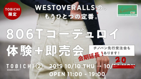 TOBICHIイベントの開催について 現在TOBICHIとTOBICHI2で開催中の〈O2〉の2つのイベントについてお知らせです。 ■WESTOVERALLS806Tコーデュロイ体験+試着会■エア・スウェッツ体験+即売会 は台風19号の影響により、12日(土)と13日(日)の営業について、臨時休業とさせていただきます。 ご予定いただいている方、申し訳ありません。 実際にお試しいただける、せっかくの機会なのに、期間が短くなってしまうのは残念です。 ぜひみなさんに体感していただきたいので、20日(日)まで、会期を延長させていただくことになりました。 14日(月)より、再開する予定です。 営業に関しての最新情報は TOBICHIのツイッターでお知らせをします。 どうか、被害が小さくすみますように。 2019/10/11 18:17 |