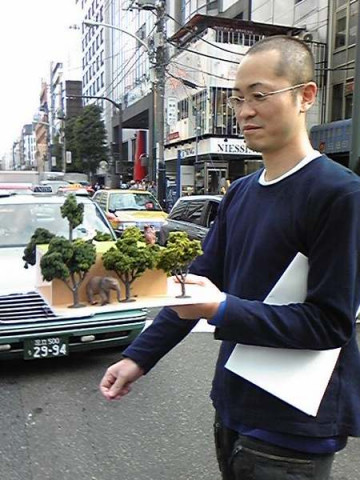 大きな体で小さな動物模型を運ぶひと。