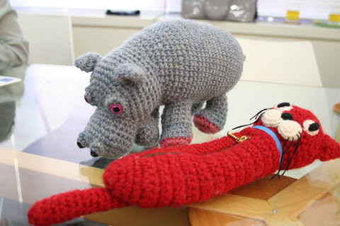 「コビトカバ」のあみぐるみと、ネコの編み針ケース。