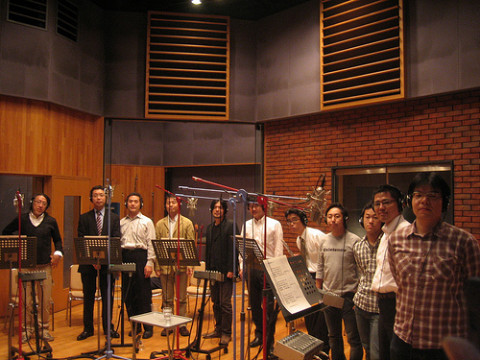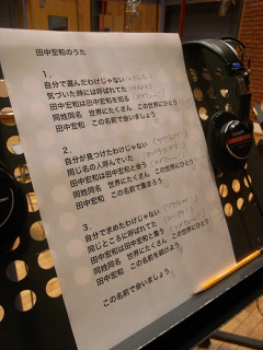 11人の田中宏和 田中宏和同姓同名観測所の田中宏和さんから連絡がはいった。 なんと、先日 「田中宏和のうた」を田中宏和さんが作詞し、田中宏和さんが作曲し、11人の田中宏和さんがと一緒にレコーディングをしたとのこと。 写真はレコーディングときの模様。 ここに写っている人はすべて「田中宏和」さんだとおもうと、たいへん不思議です。 こちらの模様は、きっとコンテンツでアップされることでしょう。 おたのしみに〜。 &みなさまのまわりに田中宏和さんがいらしたら、ぜひ「ほぼ日」まで御一報を。 2009/10/19 10:51 |