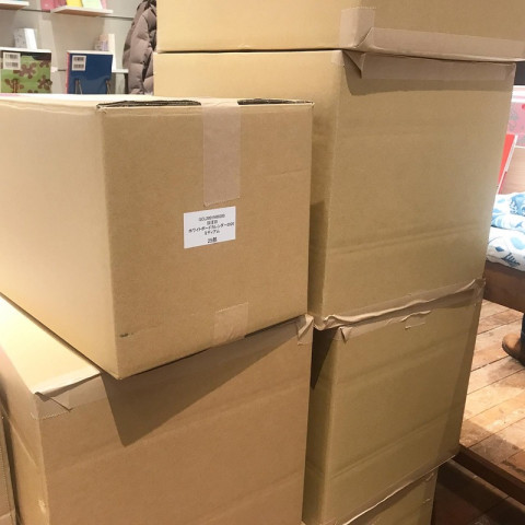 朝からたくさん届いている段ボールをあけて、検品して、たのしく並べていくぞー!