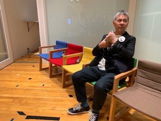 「ほぼ日曜日」のトレードマークにもなっているカラフルなイスでひと休み。
