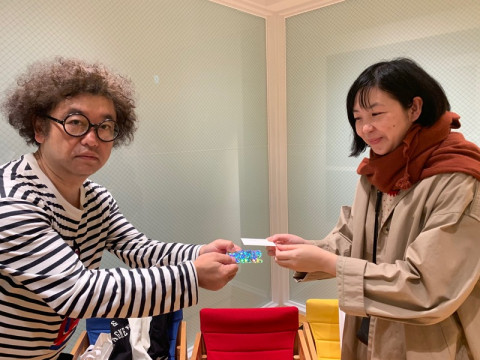 「アッコちゃんとイトイ。」の詩画集をデザインしてくださった名久井直子さんとお会いになりおふたりは名刺交換をされていました。