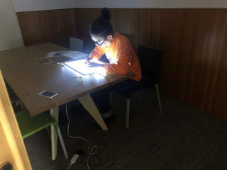 黙々と 昨晩のことです。 キッチンにむかおうと通路を歩いていて、ふと、あれ、と思って振り返りました。 誰もいないと思っていた真っ暗な空間に、ぼーーっと浮かび上がる人影! 一瞬、ひいっと思いましたが、すぐにわかりました。 その隣の会議室にも、誰かいる。 のぞくと 「ほぼ日手帳2021の本体の校正作業をしているんです」 !!! いま、まだ2019年ですよ。 再来年のことがもうはじまっているんですか。 静かな夜のオフィスの、静かな会議室で、先輩ふたりが黙々と作業をしている。 どちらも、職人! という感じがしました。 2019/12/10 12:36 |