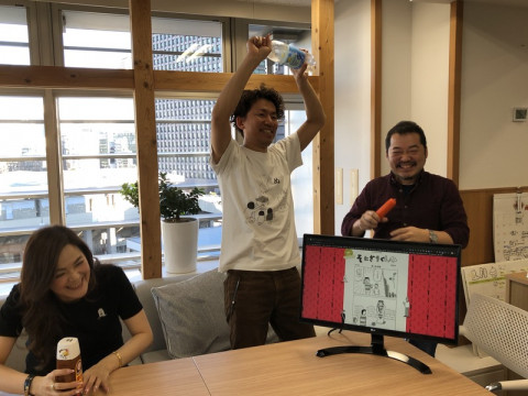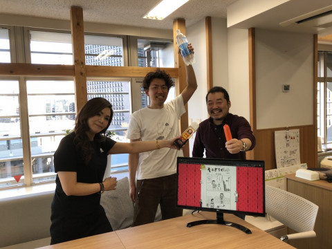 「そ」党、集まれ! 先ほど、ミーティングがあって、 おかむーことオカムラは、ソーダ。 あやさんことすずきは、ソ、ソース? そして、じぶんは、そう、ソーセージ。 ふたりは、飲みものじゃないって!? そう、そうなんです。 今回のミーティングメンバーは、毎週木曜更新の、あの人気コンテンツの担当のメンバーです。 ほら、あのコンテンツ、隠れファンが多い、シュールな、おいおい、つっこめるわかります? そ、それそれ、そうです。 「そ」がつくものを持ち寄ってそれを、それぞれ、にぎりながら、 「そにぎりくん」ミーティングをしていたのでした。 議題は、 「そにぎりくん」の作者、有田カホさんが、2月9日(日)に、東京ビッグサイトで 「COMITIA」というイベントに出て、 「そにぎりくん」の本を自費出版して販売されるのを、一緒に応援しよう!」 というミーティングでした。 (モニターに「第1話」が出てましたね」) そういうわけで、あやさんもオカムーも、すでに 「そにぎりくん」Tシャツを着て打ち合わせ。 あやさんのは、ペーソスのワンポイントだ。 いいなあ。 「そにぎりくん」の表紙画像も到着。 「そにぎり」ファンの「そ」党のみなさま、2月の予定にぜひ、書き込んでおいてくださいね。 ・COMITIA2月9日(日)東京ビッグサイト https://www.comitia.co.jp/ 有田先生のブースは、1F 西1ホールの「て30b」だそうです。 ※当日は、別に「そ」がつくものをにぎってこなくても大丈夫です。 2020/01/31 18:10 |