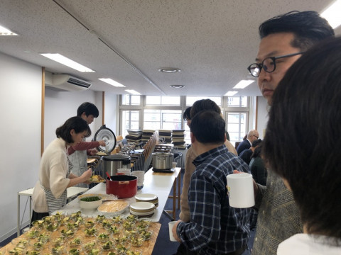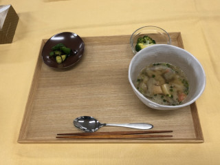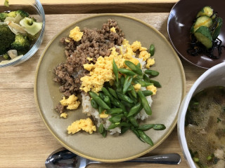 「どんだけ」スタイル。 今日の給食は、三色丼でした。 しょうもない話ですが、弊社の給食、いつもはトレーを持って1つずつおかずをとっていく方式ですが、今回はアルバイトのみんなが先にセッティングしてくれていたため、 「丼だけ」持っていけばいいスタイルでした。 そのためみんなで 「どんだけ〜、ですね」 「ほんと、どんだけ〜」 「どんだけ〜。はっはっは」 などと言い合っていたら(IKKOさん風に)、後ろに並んでいたあやこがツボにハマりました。 「わ、わたし‥‥そういうくだらないの、ほんと駄目なんです‥‥」 まあ、正確には 「丼だけ」というか 「皿だけ」か‥‥。 味はいつもながら、とてもおいしかったです。 たまごのホロホロ加減、インゲンのゆで加減など、職人技のような感じでした。 2020/02/04 13:27 |