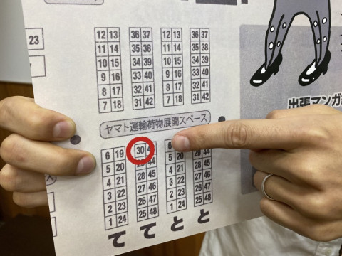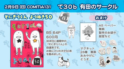 「そにぎりくん」自選本の販売@COMITIA いよいよ、あさって2月9日(日)、 「そにぎりくん」の作者・有田カホ先生が東京ビックサイトで開催されるCOMITIAで自選本を販売されます。 (写真は実際の本ではなく表紙のパネルです。) 有田先生のブースの場所はこちら、 「て30b」です。 ブースの地図をもつ 「そにぎりくん」のページをチェックしてくれます。 担当でもなんでもないのに。 そにぎり愛を感ぜずにはいられません。 さて当日は、自選本の販売だけではなく、 「そにぎりくん」キャラクターのマグネットなどを無料で配布されるそうです! 無料だなんて、すぐなくなっちゃうんじゃないかしら…。 「そにぎりくん」チームもお邪魔します。 みなさんもぜひ遊びにきてくださいね。 ・COMITIA2月9日(日)東京ビッグサイト https://www.comitia.co.jp/ 1F西1ホール「て30b」 2020/02/07 16:12 |
