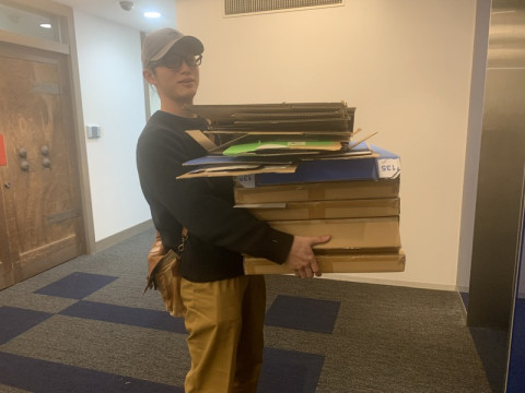 アルバイトさん はー、帰ろう、今日もがんばったぞ。 と、エレベーターに乗ろうとしたら、アルバイトの それは、ダンボール? 「そうです。帰る前に、こうしてまとめてダンボール置き場までもっていくんです。 でも、あ‥‥‥、エレベーターに乗れない‥‥あ‥‥‥、前が見えない‥‥」 というわけで、はじめて行くダンボール置き場まで、ドア開け係としてコタローくんとごいっしょしました。 アルバイトのみなさんは気がきくから、私もたまにゃあ、気をきかせないとね。 2020/02/19 20:28 |