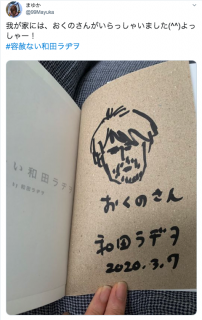 奥野さんの行方 さて、和田ラヂヲ先生の新刊 『容赦ない和田ラヂヲ』が、いよいよ、一般書店でも発売されました。 もちろん電子書籍もあります。 ほぼ日ではそれに先立ち、無観客サイン会を開催し、サイン&キンチャク袋をつけて販売をしていました。 このサイン会で、ラヂヲ先生は、限定400冊すべてに別々のイラストをそえておられたのでせっかくなので、届いたらイラストの部分を写メにとって #容赦ない和田ラヂヲ をつけてツイートしてください、というお願いをしました。 13日の金曜日くらいから徐々に「とどきました」ツイートをいただきました。 愛媛での先生のラジオ 「和田ラヂヲの聴くラヂヲ2」の常連さんたちが続々とツイートしてくださるので、投稿しないリスナーとしては、恐縮するばかりでした。 (あ、ラジオはPodcastでも聴けます) そして、チーム一同、その行方をきにしておりました、 弊社奥野の似顔絵も無事にとどけられたということを発見いたしました。 まゆかさんツイートありがとうございます。 2020/03/16 15:51 |