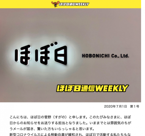 「ほぼ日通信WEEKLY」のご案内 7月1日(水)から、ほぼ日ストアにアカウントをお持ちの方で 「ほぼ日からのお知らせ」の配信希望をオンにしてくださっているみなさまに、たのしいメールマガジンをお送りすることになりました。 メールのタイトルは 「ほぼ日通信WEEKLY」といいます。 7月1日発行の創刊号には、 ほぼ日ストアにアカウントのある方は、ぜひ 「ほぼ日ストアヘルプ:メールマガジンの配信設定方法」 をご参照のうえ、 「ほぼ日ストアからのご案内」のボタンを 「配信を希望します」になさってください。 明日6月30日お昼13時00分までに 「希望します」にしていただければ、創刊号からメールマガジンをお届けいたします。 水曜朝の「ほぼ日通信WEEKLY」を、どうぞおたのしみに! 2020/06/29 20:31 |
