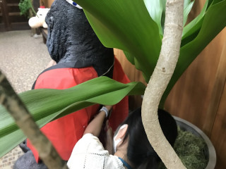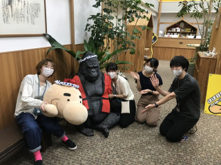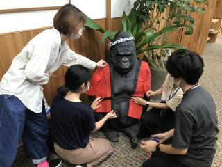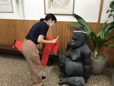 夏仕様! 夏仕様のどせいさんはいったい誰がやったんだろう? と思っていたら、すぐに謎がとけました。 入り口にいるゴリラさんにハッピを着せているひとを発見したのです。 入り口をにぎやかにしようと、発案したのはインターンで来ているお祭り好きのこっちちゃん。 そこにインターン仲間のれっちちゃんがハッピを着せようといい、もえちゃんと宮くんとワイワイと盛り上がり、ここにたどりついたようです。 ゴリラさん、上半身ががっちりしていて、ハッピのサイズがちょっとあわなかったので背中でちょっとした工夫もされています。 元気と若さあふれるほぼ日の入り口です。 2020/08/13 16:46 |