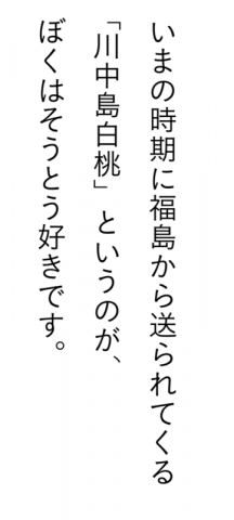 川中島白桃 桃に関して、なんの情熱? いや、さきほど、TOBICHIに駆け込んできました。 結局、悩んでB品じゃなくて、正規品を購入しちゃった。 担当の 「今年は不作ってことで、例年より果肉はちょっと柔らかめです。」 とのこと。 そうそう、そして、 今日から連載もはじまっている 9月1日発売の糸井重里の著書、 『かならず先に好きになるどうぶつ。』に、 「川中島白桃」のことが載ってるんですよ。 これは、2018年のツイートからのことば。 わたしは、このツイートをみて、 「シャチョー! ですよねー!」 と、心のなかで大声で叫んだものでした。 さて、買った桃を冷蔵庫で冷やそう。 金曜日の深夜にものすごいおいしい桃を食べよう。 なんか、今週のピークじゃないか? 2020/08/21 15:10 |