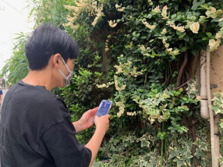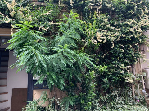 場所をつかわせていただいているお店の壁面のつる植物がすてきなので調べてもらっているの図。