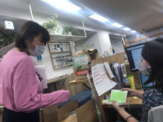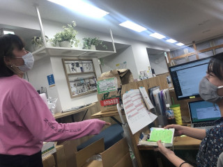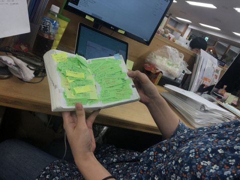 なんか、机に黄緑っぽいかたまりがあるな、と思ったら、それ、なに、付箋???