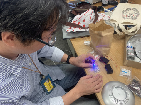 発光ダイオード。 秋葉原からもどった 「白と青どっちがいいですか?」 PARCOの「大和田ラヂヲ展」 現場監督の 「まかせる」と返ってきた。 まかせるって。 「白のほうが光が強いんですが、目立ちません。 青のほうが光が出てるように見えるかもしれません。」 あ、じゃ、青でいいんじゃない? 「光が強いという意味では白なので、いったんそっちをマジックで塗ってみますか?」 塗ろう。マッキーで塗ろう。 「たのしみ展」の撤収時に青いマッキーで箱に表書きするから、社内に青いマッキーがないわけはないのだ。 そうして、塗ってわかった。 塗ってはいけないことが。 塗ると、インクが光を遮るのだ! 青く発光しているほうが明るい。 そうして、我々は、赤崎先生、天野先生、中村先生に感謝をしたのであった‥‥。 なんか、よくわからない投稿になってきた。 2020/09/28 18:22 |