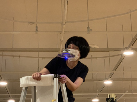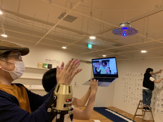 UFOも出現。 そして、あしざわ電気店にお願いしていたUFOも出現させました。 うまいことぶら下げました。 うはははは。 すごく間抜けでいい。 別の用事があったので、会社にいる電気店とつないで、設置の報告もいたしました。 そして、今回のチームリーダ・ UFOの下で語らう二人の男たち。 すこしだけかっこいいので写真をとっておきました。 さて、さて、今日の中継もぼちぼち終了でございます。 明日は私は現場にいけないので、憶測テキスト中継で駆け抜ける予定です。 また! 2020/09/29 19:57 |