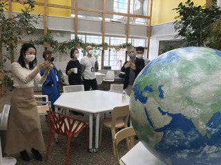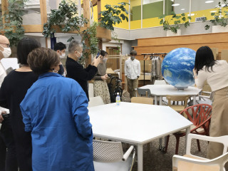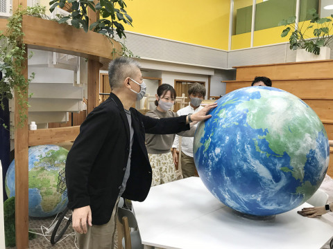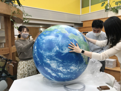 巨大アースボール! アースボールの発売まで、あと7日! 発売当日の11月5日(木)は、 「銀座LOFT」「丸善 ラゾーナ川崎店」 「阪急うめだ本店」の3店舗で、実演販売会を予定しています。 (くわしくはプレスリリースをどうぞ) 「ほぼ日」を知らない人にも会場で足を止めてもらえるように、リーダーの古謝さん、秘策を考えました。 「こんなものをつくってみました」 そういって取り出したのは、大きな、大きな、アースボール! おぉぉ、これはいい作戦です! これがあるだけでも、だいぶん歩く人の目を引きますね! そんな大きなアースボールをひと目見ようと、まわりにいた乗組員もぞくぞくと集まってきます。 そこにタイミングよく糸井も通りかかり、ちょっとした撮影会のような感じに。 もし販売会場にいらっしゃるときは、ぜひこの「大きなアースボール」を目印にしてくださいねー。 さあ、発売まであと7日! 販売準備もラストスパートです。 2020/10/29 19:24 |