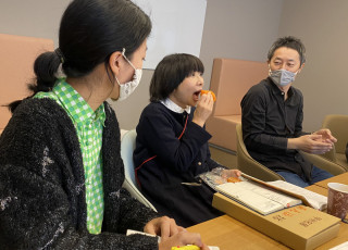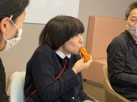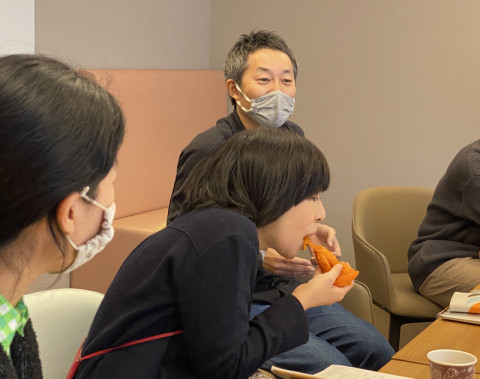 秋のよみものチーム・ミーティング あたらしいオフィスに引っ越してきてちょうど1週間。 気持ちもあらたに、今日は、はじめてのミーティングルームでよみものチームミーティングをやりました。 秋から冬にかけてのコンテンツについて、いろいろまじめに話していたら、ふと、目に入ったのが、おもむろに、干し柿を取り出す それまでの会話とまったくなんの脈略もなく、ふたつの柿のうちのひとつをパッケージから出して、横に座ってまじめに話していた とっさの出来事だったけど、あまりのことに、写真にしっかりおさめました。 柿がおいしい季節ですね〜 「言うてる場合か!」 永田さんの声が聞こえてきそうな秋のひとこま。 新オフィスでも、よみちーメンバーは健在です! 2020/11/24 19:37 |