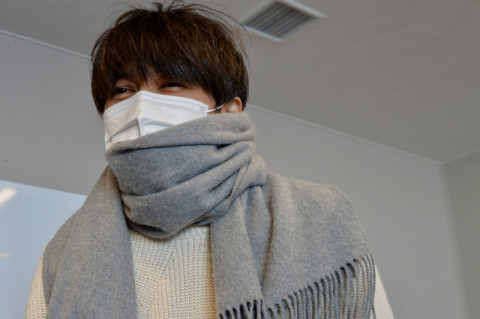 暖房の効いた部屋でマスクときつくマフラーをして目しか見えない