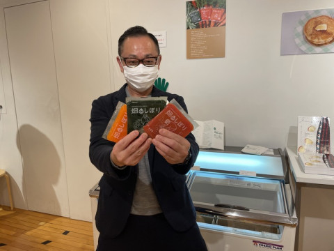 おがりん。 あ、そうそう、それでですね、1月27日に発売開始になる、野菜ジュース、「畑deしぼり」も、 「おやつ展」で先行販売中です。 フルーツのような甘みの 「京くれない」 フルーティな味わいの 「ひとみ五寸」 苦味の中にも甘みがある 「ハニーケール」の3種類。 今日は、二代目おがりんこと、 初代おがりんとは、 「へなちょこ雑貨店」の小川さんです。 のちにほぼ日でも働いていて、おがりんとよばれてました。 いまは、宮古島にいます。 いや、回り道をしている場合ではありません。 「畑deしぼり」は、いま「できるまで」も連載中ですのでこちらもぜひどうぞ! ちなみに、こちらのジュースは、 「冷凍」です。 なんか少々レトロな駄菓子屋の前でアイス売ってたような冷蔵庫が設置されてて、きいたら、 「生活のたのしみ展」で、斉吉商店さんのお店の担当をしていたときに、冷凍庫の手配をたのしみ展担当の荒馬・ 人生とは、手配よな。 2021/01/23 17:04 |