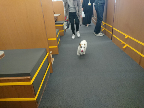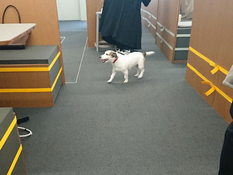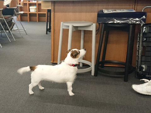 窓から外の様子を見たり、社員の手をなめたりしながら。