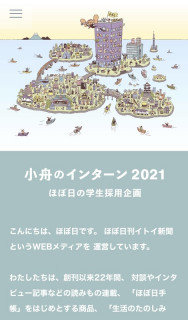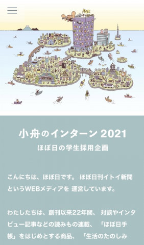 採用募集中です。 ほぼ日ではいま2つの採用募集を行っています。 ひとつめは新卒入社をご検討くださっている方向けの採用直結型インターンシップ、 「小舟のインターン2021」です。 昨年度からはじめて実施しているもので今年で2回目の募集です。 応募締め切りは今週水曜日、2月24日午前11時と近づいてきています。 対象学年が決まってますか、と問い合わせをいただくことがあるのですが募集要項にある対象学年で、インターンシップに参加いただけるみなさんご応募いただけます。 年に一度の機会です。 ご興味ある方はぜひいまのうちに募集ページをご覧くださいね。 「小舟のインターン2021」募集ページはこちら そしてもうひとつは カスタマーリレーションズチームの募集です。 ほぼ日のお客さまの窓口としてお問い合わせ対応を担当しているチームです。 国内はもとより海外からのお客さまの問い合わせも多く、今回は日本語、英語で対応いただける方を募ります。 こちらは3月2日(火)午前11時までの募集です。 「カスタマーリレーションズチーム」募集ページはこちら 小舟のインターン募集ページではほぼ日ではたらく様子をご応募くださる方に感じていただけるよう、第一期生のインターンのみんながあれこれ思案して会社の紹介コンテンツを作ってくれました。 こんなふうに会社のことを紹介するの、初めてじゃないかなと感じてます。 小舟のインターンに応募するみなさんはもちろん、カスタマーリレーションズチームに興味のある皆さん、ご応募しなくてもほぼ日の中の様子をのぞいてみたい皆さんにもきっと楽しんでいただけるのではと思います。 ぜひご覧くださればうれしいです。 それではみなさんのご応募、楽しみにお待ちしています。 どうぞよろしくお願いします! 2021/02/21 16:00 |