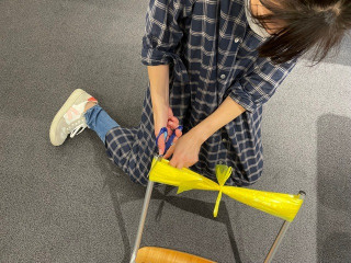 私が買ってきた黄色い荷造りテープを、すぎやまが慣れた手つきで椅子の脚に巻きつけています。