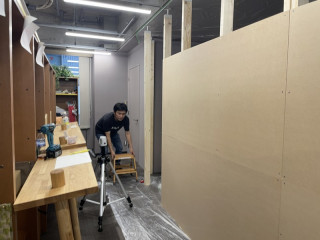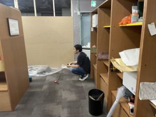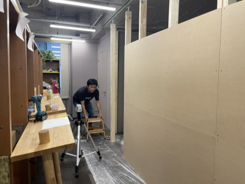 西田工務店、活動中。 金曜日に、電源ケーブルをとりに4Fのロッカーにいったら、 見ると、壁でした。 あんまり4Fをここで紹介したことがなかったけれど、この壁の向こうは、開放的な壁なしの座敷があったところです。 そこに壁です。 壁をDIYするといえば、昨今は、2?4の木材にあわせた突っ張り金具で柱をたてて、そこに板を貼り付ける、あの技法です。 (DIYもののYoutubeで得たにわか知識) また、レポートします。 いま、だれかが大慌てで、でかいロゴデータをさがしていました。 2021/07/12 11:12 |