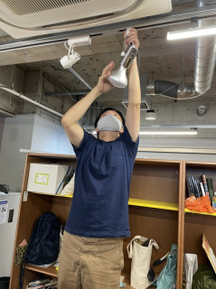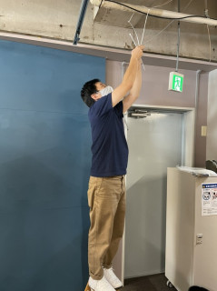 さきほど入り口近くにかかげるタペストリーが届いたので、吊るすために、工夫をしたり、照明をあてたりしています。