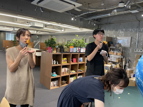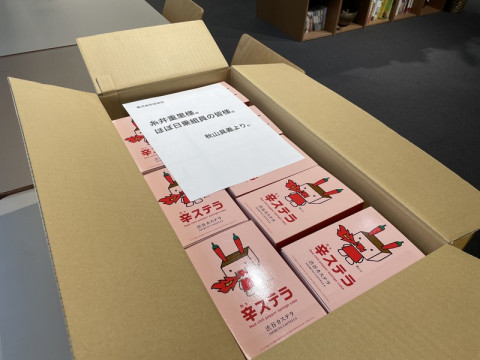 とどいたもの。 ほぼ日の例の耳のでかいおさるを描いてくださったアートディレクターのアッキィさんこと秋山具義さんから、ほぼ日のみなさんで、ということでおとどけものがありました。 「辛カステラ」 抹茶、黒糖、はちみつ、柑橘などの様々なカステラはあれども、辛いカステラはないな、ということで企画・プロデュースしたので、おくっていただきました。 長崎の『文旦堂』という老舗のカステラ屋さんがつくってくださったということでした。 わくわく。 受付にいたみんなで早速いただきました。 「うん。おいしい‥‥あれ?」 いや、感想はこれよ。 ちゃんとしたカステラ! おいしいカステラ! あれ、辛い。 これこれ。 ちゃんと辛いので、体はホカホカします。 渋谷のミヤシタパークで販売しているそうですよ。 2021/08/12 11:57 |