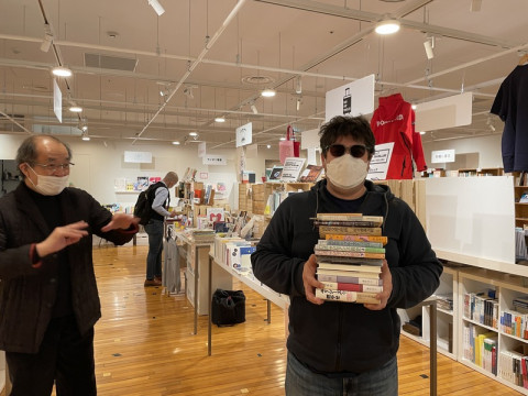 これからやらかす人と。 もう、撤収の話をしなくちゃいけない局面の 「本屋さん、あつまる。」です。 会期は2月2日まででして、ただいま追加本がとどきつつも、返品する場合の相談などを並行してやっているのです。 あ、今日は両国の本屋さん、 「YATO」さんが、補充にきてくれます。 このままじゃ、週末を越せないとこだったので、ナイスなタイミングでした。 週末、がっちりマスクして、入り口でアルコールでザブザブ手を消毒して店内にどうぞ! そうそう、それでですね。 昨晩、鴨さんが急に、どっさり本を購入していました。 なんかタガがはずれたっぽいです。 そして、今日はちょっとご相談があったのでパルコまで来ていただいていた凸版の藤井さん。 相談終了後、棚をめっちゃ物色中。 やらかすに違いない状況です。 2022/01/27 15:04 |