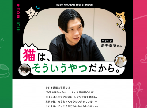 祝・ネコの日! にゃーにゃーにゃー。 今日はネコの日です。 しかも2がたくさん並ぶネコの日です。 2022.02.22! 今年、インタビューに登場してくださったのは、ハライチ・岩井勇気さんです! 愛猫モネちゃんの話や、猫がなぜいいのか、などなど たくさん語ってくださいました。 ドコノコ担当の たまたま4階に揃ったので、3人で猫ポーズをきめてみました。 ネコの日おめでとう〜! あ、しかも時計の長針と短針も 「2」!(偶然にびっくり!) 2022/02/22 15:30 |