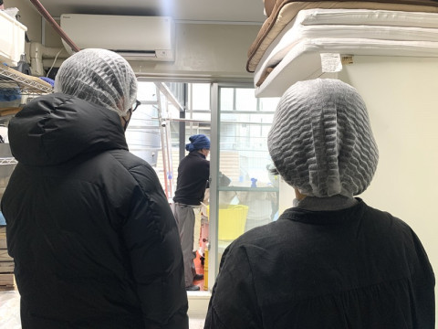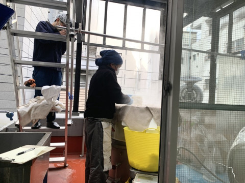 酒蔵を見学。 「東京港醸造」に行ってきました! 朝9時現地集合。 三田のオフィス街をちょっと裏道に入ると、真っ黒でシックな縦長のビルがもくもくと蒸気をあげていました。 思わずマスクをほんの少しずらしたら、炊きたてご飯のいい匂い。 ビルの最上階で、日本酒の仕込み中だったみたいです。 写真は、酒蔵のリーダー=杜氏さんが、腰まである巨大な鍋で炊けたお米を、大きなしゃもじですくっている様子。 このあと杜氏さんは、せっせと下の階に降りていきました。 地球の重力をうまく使って、ビルの上から下へと酒の製作工程が変わっていくのだそう。 すごい。 この模様は、たのしみ展まわりの動画でお届け予定です。 おたのしみに! 2022/02/24 16:13 |