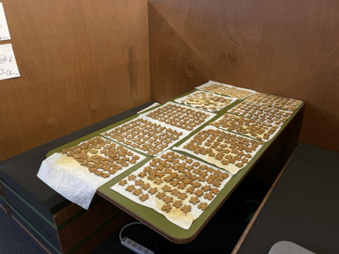 怪しい職人の方々。 先日、キッチンにて、パーカーがユニフォームなのかと思ってしまうほどの人々がいました。 どうやら、あるものを作るために集まっていて、服が汚れるので、ってことみたいですが、フードは本当にたまたまなようです。 そのあるものというのは、こちら。写真3枚目。 おいしそうなクッキーではなく、パルコの「ほぼ日曜日」で開催中の 「大嘘博物館 カプセルトイ2億年の歴史展」で古代のガチャを回すと出てくるすてきなものなのです。 わたしも先日行きましたが、子どももおおよろこびでした! あんなにガチャガチャをしまくっていいことなんてなかなかないですから。 夢のような空間だったんだと思います。 3月21日までやっていますので、まだの方は、ぜひ足を運んでみてくださいね。 最後の写真は、約一ヶ月くらい前の同じ状況の写真です。 パルコチームをはじめ、有志たちがフードかぶって、せっせと、がんばって作っています! わたしも次回は、手伝おう。 2022/02/28 10:57 |