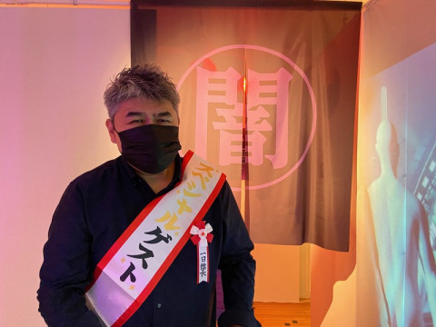 闇ゾーンを前に、怪しげなのれんの前に立つ一日館長。