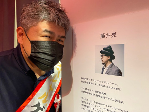 ここにきてようやく、元同僚の藤井亮さん(の写真)とツーショットが撮れた一日館長。