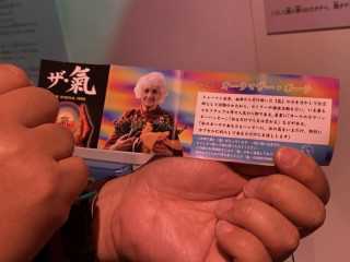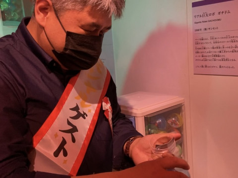 一日館長の「ガチャケット」 ひろのぶさんはひとつひとつの展示にリアクションを取り、解説文をしっかりと読み込むのでもう2時間ほどいらっしゃっています。 「それじゃあ闇ガチャ引いていきましょう。 この『ザ・氣』です。 うわ、なんやこれ、もともと一回5000円て書いてあるやん。 高すぎるやろ。 今日はこのコインで引きますね。 ……お、カプセルが出てきました。 館長としては、このカプセルの中身を見る前に空のカプセルをきちんと箱に入れる。 これをぼくは『ガチャケット』と言いたい。 ここにきて、新しい言葉が生まれました。 さて、『ザ・氣』の中身は、ん、なんやこれ。 あのカプセルのほうに氣が入っとったんかい。 ガチャケットが裏目に出たわ。 ほんま藤井くん、やってることおかしいわ」 2022/03/19 13:59 |