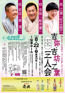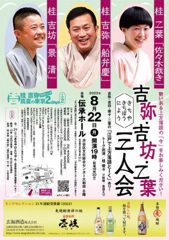 注目の三人会 落語なのに芝居、芝居なのに落語――といえば、古典芸能に精通した桂吉坊さんが見せてくださる芝居噺。 本日アプリで再配信のほぼ日の學校・歌舞伎ゼミ第8回では、芝居(歌舞伎)が大好きな人々が登場するみごとな芝居噺を吉坊師匠が見せてくださるのですが、おしまいの方にある、お囃子の分解解説と実践という豪華ワークショップも見逃せません。 幽霊を幽霊たらしめる太鼓と笛。 お囃子と相まっての名演技というのがよくわかります。 動画を見返していると、 「あぁ吉坊さんの落語が聞きたいなあ」 という気持ちになってきます。 なので、調べてみました。 これから先の公演。 8/25 西宮市極楽寺の瓦林寄席 8/28 大阪市天王寺ほんまち錢屋ホールにて古典芸能のプロが集まる「菅原伝授手習鑑」 (木ノ下歌舞伎主宰の木ノ下裕一さんと共演) 9/13 大阪市北区の天満天神繁昌亭 うーん、関西が多いなあ、と思ったら、東京公演がありました。 8月22日(月) 渋谷区文化総合センター大和田の伝承ホール。 「吉弥・吉坊・二葉 三人会」 いま飛ぶ鳥を落とす勢いの桂二葉さんもご登場です。 さらに三味線は、ほぼ日の學校に来てくださった恩田えりさんの予定です。 ご都合があえば、ぜひ! 2022/08/03 11:05 |