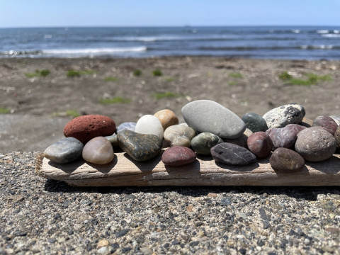 惑星を拾ったかもしれない!? 宮田珠己さんの授業 「いい感じの石ころのひろいかた」 本日より、公開です。 海辺へ石拾いのロケに行ったのは、寒風吹きすさぶ12月。 でも、とてもたのしかったのでお盆休みにも、立ち寄った海辺で石ころを拾ってみました。 あっつかったのですが、いろんな色があって、つい夢中に。 波打ち際でキラキラ光る石を探して歩くのは、無心になれる、とてもいい時間です。 手に持っているのは「惑星」だと。 なるほど?シュッと入った線がそう見えるような?? 私から「脂身のお肉みたいですよね?」 と送った写真は、 何に見立てても自由ですから、いいですけど! 宮田珠己さんの授業では、自由気ままな石拾いの他にも、宮田さんのアンテナがピピッと動いたおもしろい風景、たのしい道端の像など写真で紹介いただきながら、自分なりの「いい感じ」の探し方についてお話をうかがいました。 どうぞのんびり、ご覧ください。 毎日の中に、自分なりのいい時間がちょっと増えますように。 2022/08/22 11:01 |