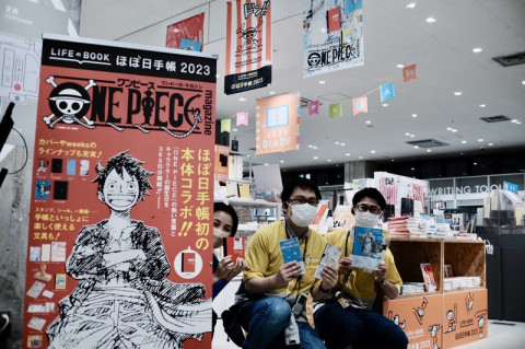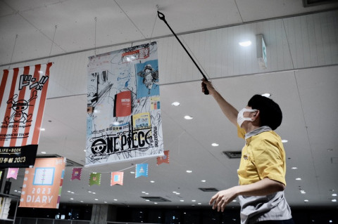 いよいよ明日から! ワンピースマガジン×ほぼ日手帳 いよいよ明日10/1(土)から販売開始です! さきほど 大きなルフィのバナーや海賊旗をイメージしたタペストリーなど、かっこいい売場に仕上がっていましたよ〜。 予定になかった、スタンプをどん!と試せるスペースもたっぷり場所をとって作っていただきました。 (金子さん、坂元さん、お忙しいところありがとうございました!) そして、ほぼ日本社1FのTOBICHIも、もちろんばっちりワンピース仕様。 夕方様子をみにいったら、最後の仕上げの真っ最中でした。 明日は予報を見る限り、全国的によいお天気にめぐまれそうですし、ぜひ秋のお散歩がてら店頭に足を運んでみてくださいね。 2022/09/30 22:47 |
