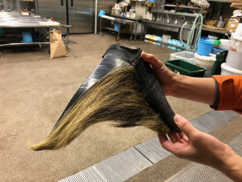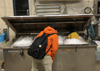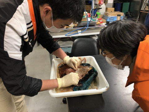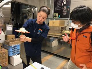クジラの鼻水 海の哺乳類の研究者・田島木綿子さんが、おそろしく大きく鋭い包丁をどんな風に使うのか見せてくれました。 「クジラ包丁」といって、クジラの解剖に欠かせない道具だそうです。 国内で製造できるところは、一箇所しか残っていない貴重な品。 去年刊行され順調に版を重ねる 『海獣学者、クジラを解剖する。 海の哺乳類の死体が教えてくれること』 (山と渓谷社)があまりにおもしろいので、ほぼ日の學校へのご登壇をお願いしに、つくば市にある国立科学博物館の施設に (ご快諾いただきました!) 3年半前、国立科学博物館特別展「大哺乳類展2」にあわせて開催したほぼ日の學校・ 貸し切り「ナイトミュージアム」でスペシャルトークに登場してくださった田島さんは、海獣学者として、海岸に打ち上げられて死んでしまったクジラやイルカを解剖し、どうしてそんなことになったのか経緯や死因の究明をしていらっしゃいます。 研究のための標本づくりも大切な仕事。 著書では、血まみれ汗まみれ、暑さや寒さに耐えながら、クジラの巨体に向かっていく壮絶な姿が描き出されるのですが、 「クジラの爆発」やきれいな骨を作るための「鯨骨スープ」、ピカピカの骨を作ってくれるカツオブシムシなど、知らない世界の話が次々と出てきます。 クジラの「ヒゲ板」など貴重な標本を見せていただいた中、強い衝撃を受けたのが、一頭のクジラの胃から見つかった4枚の大きなビニール袋でした。 海洋プラスチックが生物の命を危険にさらしていることは、読んだり聞いたりしていましたが、生々しい実物には言葉を失いました。 田島さんの授業については、近日中に詳細をお知らせしたいと思いますが、クジラに関して別のお知らせをひとつ。 三宅島にある「クジラの見られるカフェ」 カフェ691の代表・沖山雄一さんが発起人となり、全国の研究者で調査チームが編成され、ドローンを使ってザトウクジラのブロー(鼻水)を採取。 クジラに負担をかけずに健康診断をしたり、DNA解析などの研究を行う 「三宅島クジラ鼻水プロジェクト」がもうすぐ始動します。現在、クラウドファンディングを準備中だとか。 このプロジェクトには、田島さんも参画していらっしゃいます。 以下のSNSから随時、進捗情報がアップされるそうです。 プロジェクトHP : 三宅島クジラ鼻水プロジェクト Twitter : @miyake_whale 2022/10/24 21:05 |