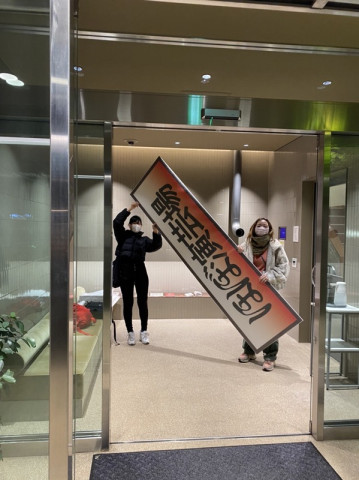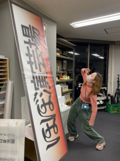 に呼ばれて向かうと、そこには高さ2mを超える巨大な看板がありました。お、おおきい‥‥! これを、これからパルコに運びます。