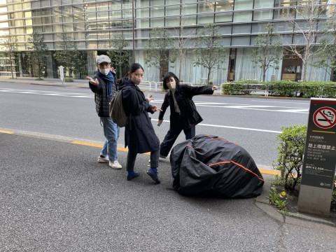 桜の花散るビルの前に、大きな荷物と、ひとり。