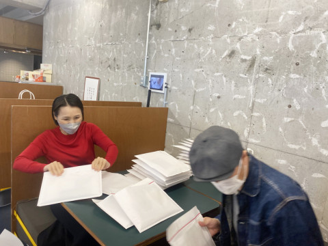 人がぞくぞく。 さきほど 「いまから大量の内職的なことをやるのでお手伝いできるよ、という人がいたら一緒にお願いできますでしょうか!」 と呼びかけたところ、もうさっそく、あちこちから人がぞくぞくと。 3Fの入り口の扉から、次から次へと、 「やりまーす」という人が入ってきて、なんだかマジックのようでした。 ベテランの 「永田さんのスピードについていけない‥‥」 などとあややが茶化しつつ、息のあった無駄のない封筒入れ作業。 こういうみんなでの共同作業は弊社の得意技のひとつです。 こうやって、伝統は引き継がれていく‥‥。 2023/04/06 14:31 |