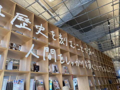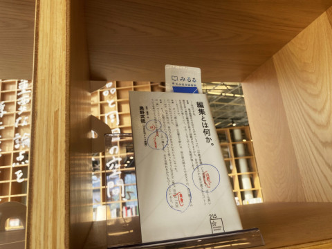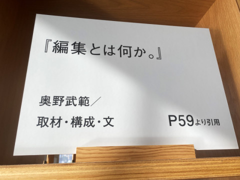 いきなり出合う たまたま個人的に栃木県の黒磯を訪れ、行ったお店の人に 「駅前の図書館、すごくいいですよ!」 とおすすめされて、 「那須塩原市図書館 みるる」 に行ってみたところ、館内にいくつか、インパクトあるでっかい文章のパネルが。 本からいろんな文を抜き出して、メッセージとして飾っているようで、 「おおお、大きくてかっこいいなー、いまの図書館はおしゃれだなあ」 とか思っていたら、ふと、そのもとになった本と、パネルに書かれた名前に見覚えが。 ─────────── 『編集とは何か。』奥野武範/取材・構成・文 ─────────── ‥‥普通に、編集部の先輩の 「編集とは何か」から生まれた本でした。 おおお、すごい。 こんなことがあるんだ。 こうなっているということは、きっと図書館のどなたかが読んで、 「あ、いいな!」と思われて、 「これを図書館に来る人たちに伝えたいな」と思われたということ。 うわー、記事に込められた思いがこうやって届いているんだ‥‥と思い、なんだかめちゃくちゃ感動しました。 しかもこの図書館、地域の中高生がものすごくいっぱいいるんですね。 そういう子たちに向かって、 「この言葉を届けたいな」と思われた方がいたと思うと、ほんとすごいなあ、と。 まあ、一点反省がありまして、この図書館はおいしいソフトクリームを食べられるのですが、奥野さんの名前に気づいたとき、ちょうどソフトが溶けそうだったんですよね。 ‥‥ということで、パネルの写真がやたら中途半端な感じではありますが、すみません、そこはお許しを。 とりあえず、今日たまたま出合った嬉しかったことのご報告でした。 2023/05/12 20:14 |