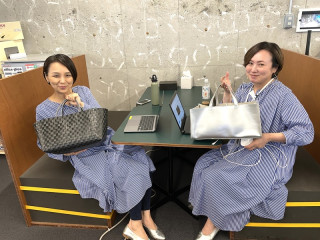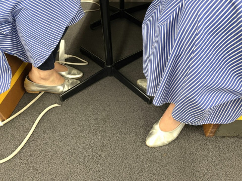 社内で、ほぼ日グッズがおそろいになることはすくなくないのですが、今日の二人はワンピースも、靴もおそろい。