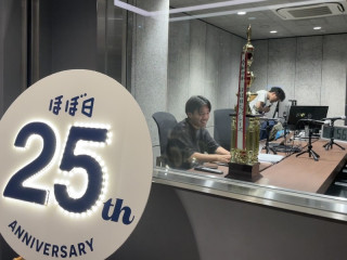 ラジオブースはその後も準備が進んで、外には電飾キラキラの25周年パネルが立っていました。