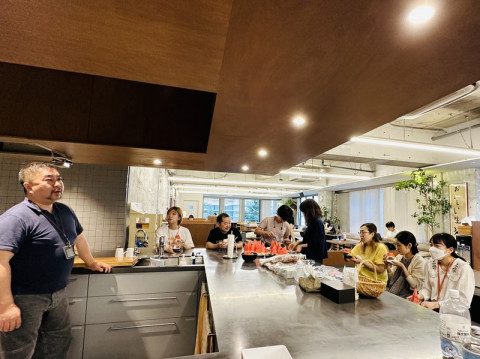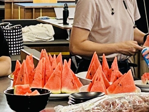 夕方のすいかタイム 「すいかが切れたよ〜」 という連絡が全社的に入ったので、みんながわらわらと3階のキッチンに集まってきました。 立ち位置的に (ありがとうございます、ごちそうさまです) とがった切り方が、ナイスです。 すいかって、やさしい甘さで、のどの乾きが癒えます。 おなかもいっぱいにならないし、夕方のおやつにぴったりです。 何人かは、塩をふって食べていました。 半世紀以上生きている私からみても、小さいときからずっと存在感が変わらない、夏の食べものだなぁ。 2023/07/26 17:09 |